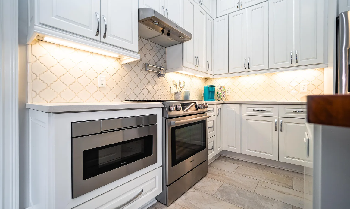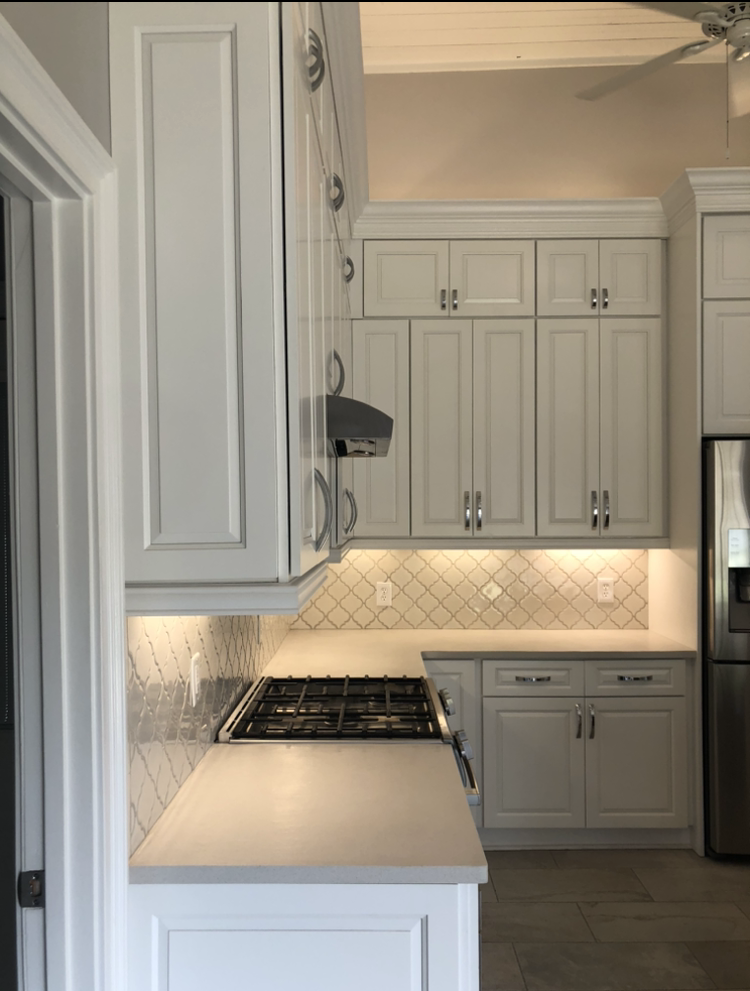 Gramercy White Cabinets, White Quartz, and Arabesque Tile